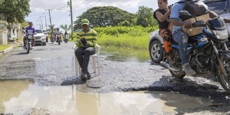 Casi detrás del hospital Mario Tolentino Dipp el pavimento de la vía se deterioró y en su lugar se forma un charco en la tierra que afecta la circulación vehicular.